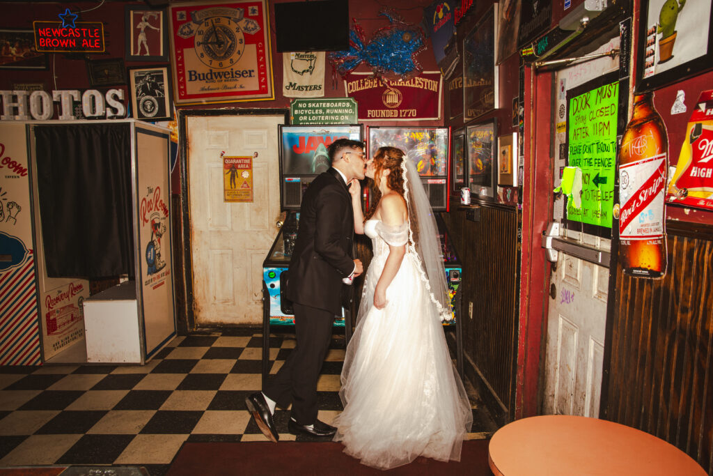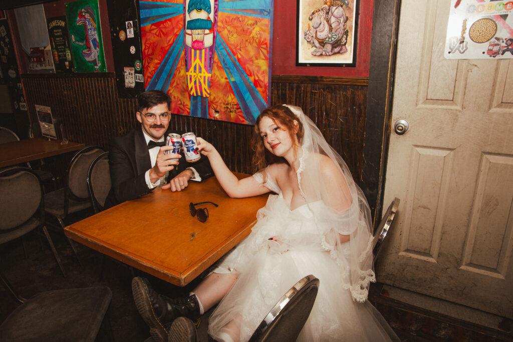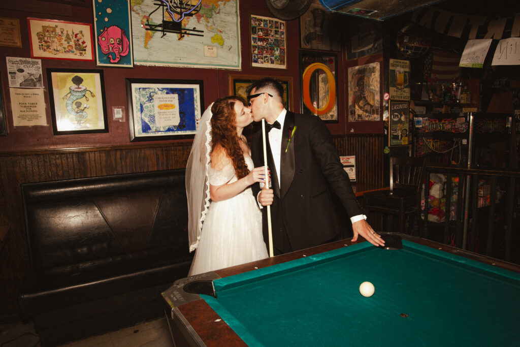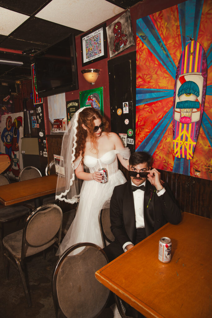 One of the most memorable parts of their day was our stop at The Recovery Room, a dive bar filled with history for the couple. It’s the place where their story began. The moment we stepped inside, everything felt like a romantic indie film. They held cans of PBR, laughed their way through foosball and pool, and took candid shots in the retro photo booth.