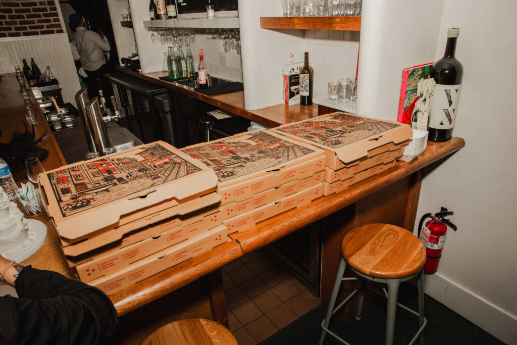 Everyone gathered around local pizza, slices of cake, and glasses of wine that never seemed to empty. The room felt warm and alive with connection. Every toast carried genuine emotion. Every laugh felt like a reminder of the community surrounding this couple. Emma and Jared’s love of wine added another layer of intimacy, with each glass raised in honor of their past and all the dreams ahead.